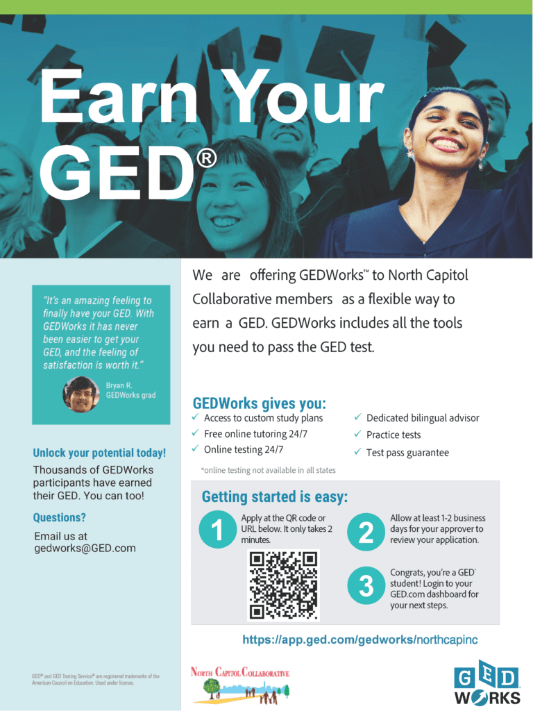 North Capitol Collaborative, Inc. (NCCI) offers a flexible, supportive GED Program to help adults earn their high school equivalency credential and take the next step toward employment, post-secondary education, or career advancement.